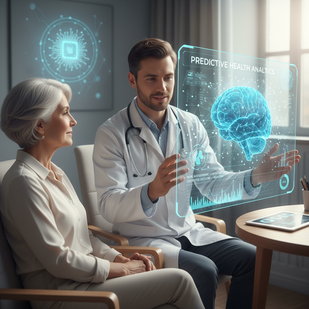 Lekarz i senior analizują dane predykcyjne AI na ekranie, symbolizując nowoczesne trendy w opiece zdrowotnej.