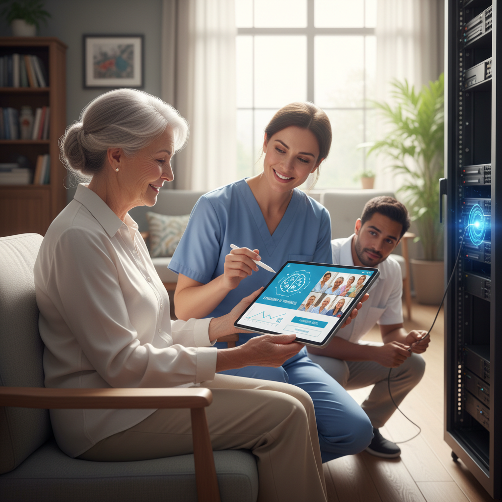 Seniorzy w domu uczą się korzystać z tabletów i aplikacji AI, wspierani przez opiekuna.