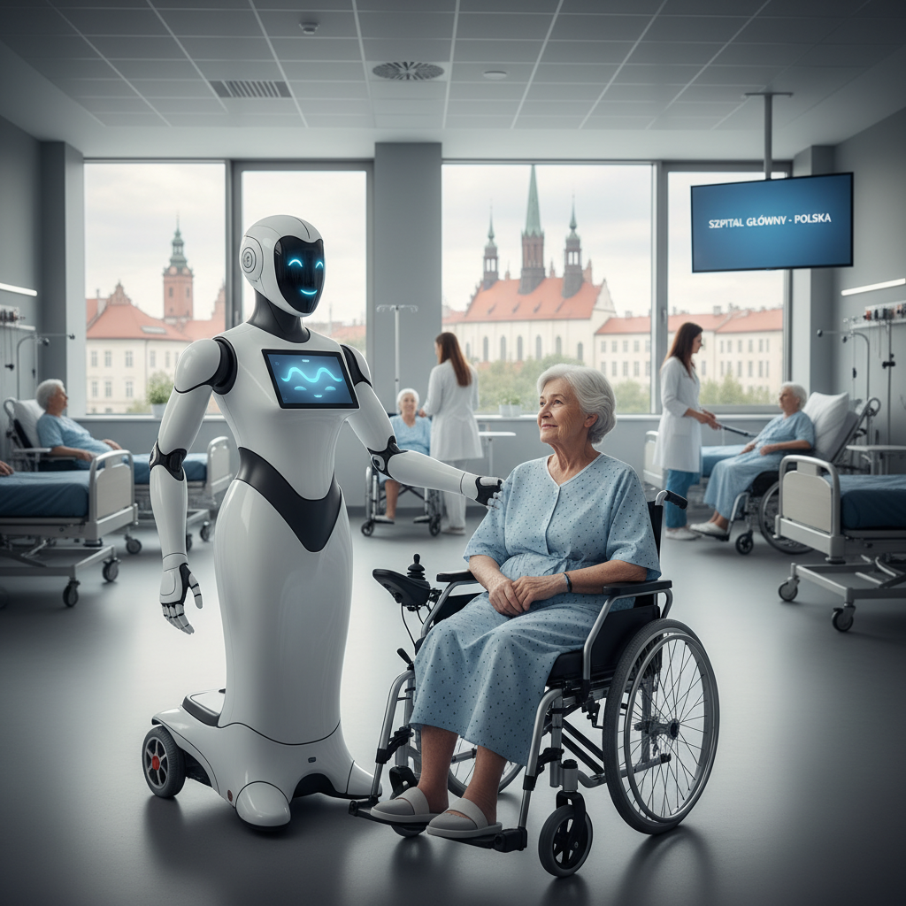 Seniorzy w szpitalu, wspierani przez pielęgniarkę oraz asystenta AI, symbolizujący zmiany demograficzne i technologiczne w Polsce.