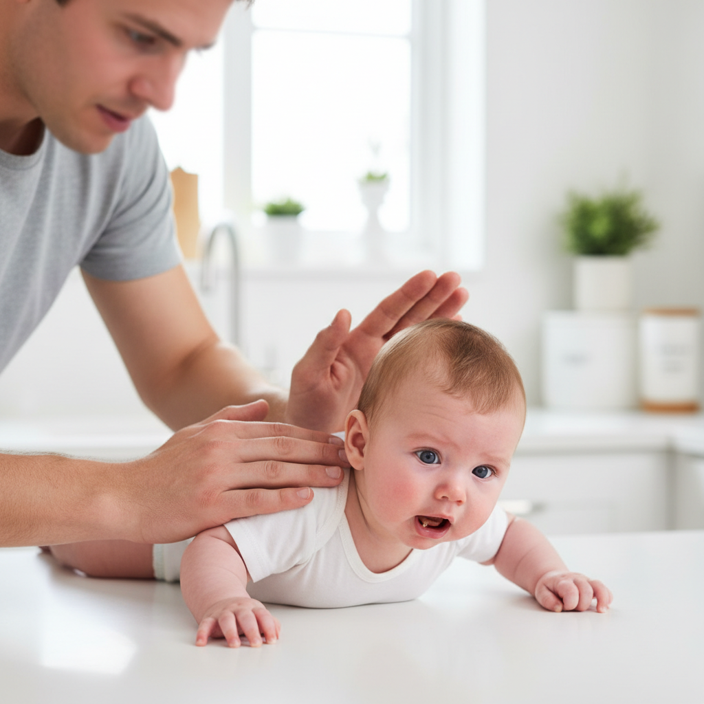 - Ułóż niemowlę głową w dół na swoim przedramieniu, podtrzymując głowę.