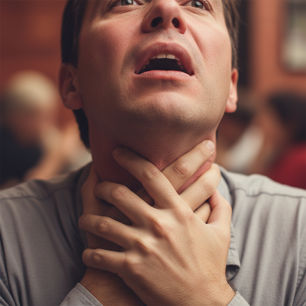 Chwytanie się za gardło – uniwersalny sygnał wskazujący na zadławienie, rozpoznawalny na całym świecie.