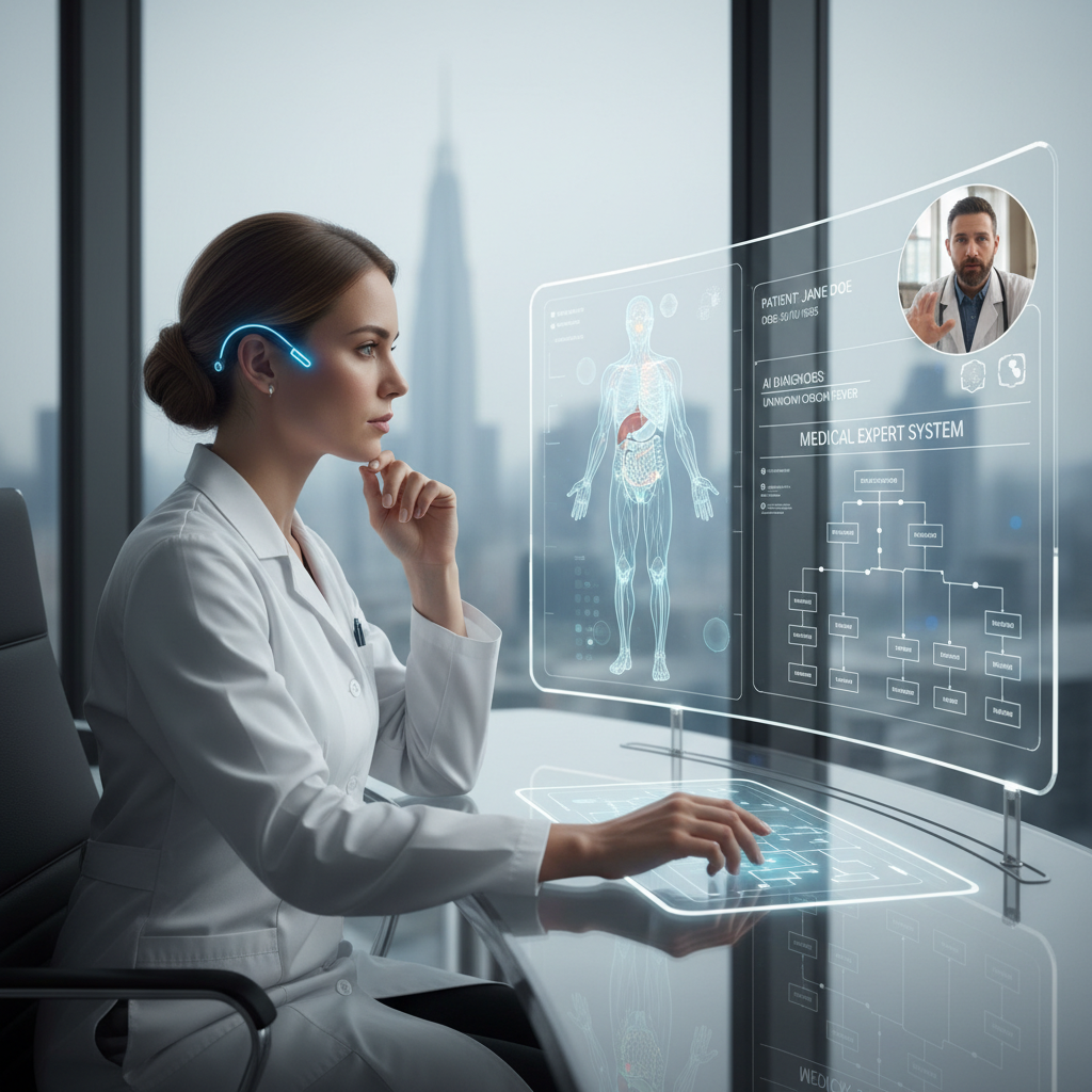 Zdjęcie pokazuje lekarza analizującego dane za pomocą systemu AI, ilustrując jak zdrowotne systemy ekspertowe funkcjonują w praktyce.